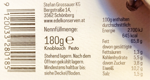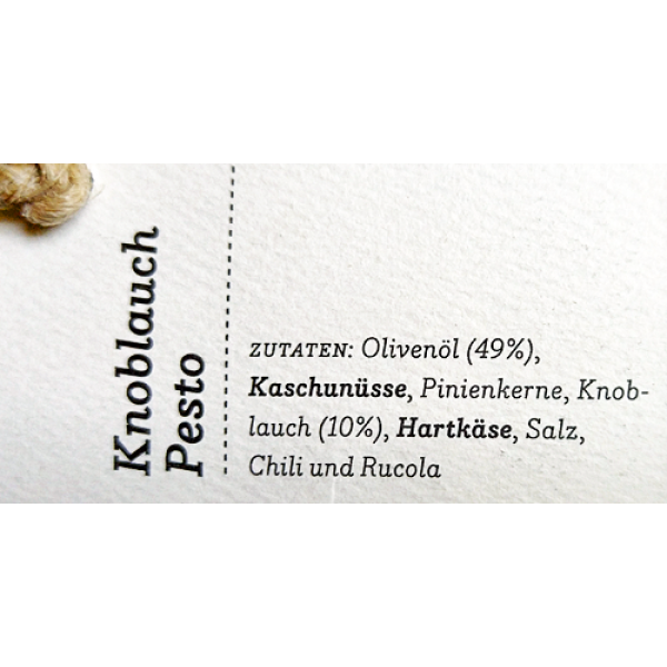 Speiseempfehlung: Knoblauchpesto lässt sich sehr gut kombinieren als peppige „Würze" zu Spaghetti, mit getoasteten Baguette-Scheiben, zum Würzen von Grillfleisch und vielen anderen Speisen, Variieren empfohlen!Allgemeine Speiseempfehlungen: Jedes unserer Pestos eignet sich hervorragend zum Anrichten von belegten Broten, als geschmackliche sowie optische Verfeinerung von Kanapees und eben natürlich als wunderbarer Begleiter zu jeder Art von Pasta.