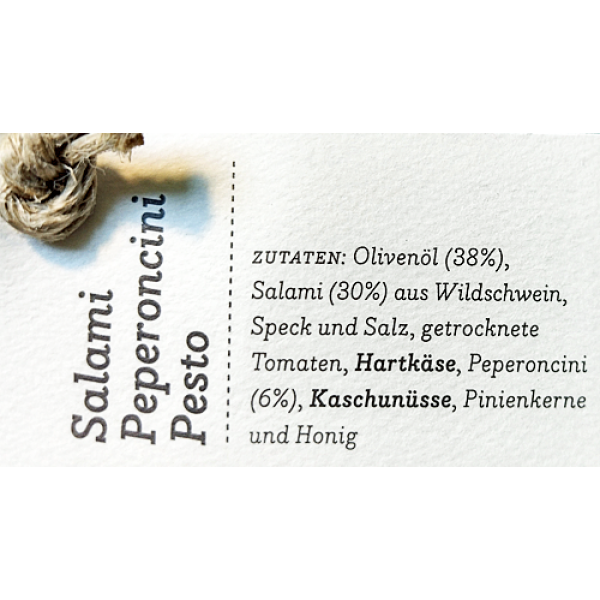 Das Salami Peperoncini Pesto ist ein feines Pesto aus Olivenöl, Wildschweinsalami, Peperoncini und anderen wertvollen Ingredienzien. Eine geschmacksintensive Mischung, die viele kulinarische Einsatzmöglichkeiten erlaubt. Alleine der Gedanke an dieses würzig-pikante, volle Empfinden am Gaumen, lässt mir das Wasser im Munde zusammenlaufen - mittlere Schärfe, schönes Salami-Aroma, herrlich!
